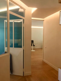 Les cloisonnements bureau et cuisine sont entièrement repensés avec création de verrières intérieures. Côté cuisine, la verrière intègre des ouvrants pour une communication maitrisée avec la pièce à vivre et la porte d'entrée est également de type verrière, dotée d'une ouverture coulissante à galandage. Un gros travail est effectué sur l'éclairage, en grande partie indirect.